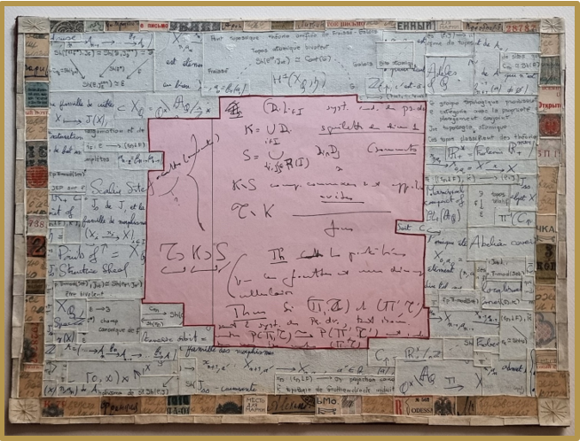 L’Institut a reçu de l’artiste Dominique Lepetz, ancien élève d’Alexander Grothendieck à l’université de Montpellier, le don d’une œuvre très spéciale : un collage au centre duquel se trouve un manuscrit original de Grothendieck, entouré de fragments de textes mathématiques d’Alain Connes, Laurent Lafforgue et Olivia Caramello.